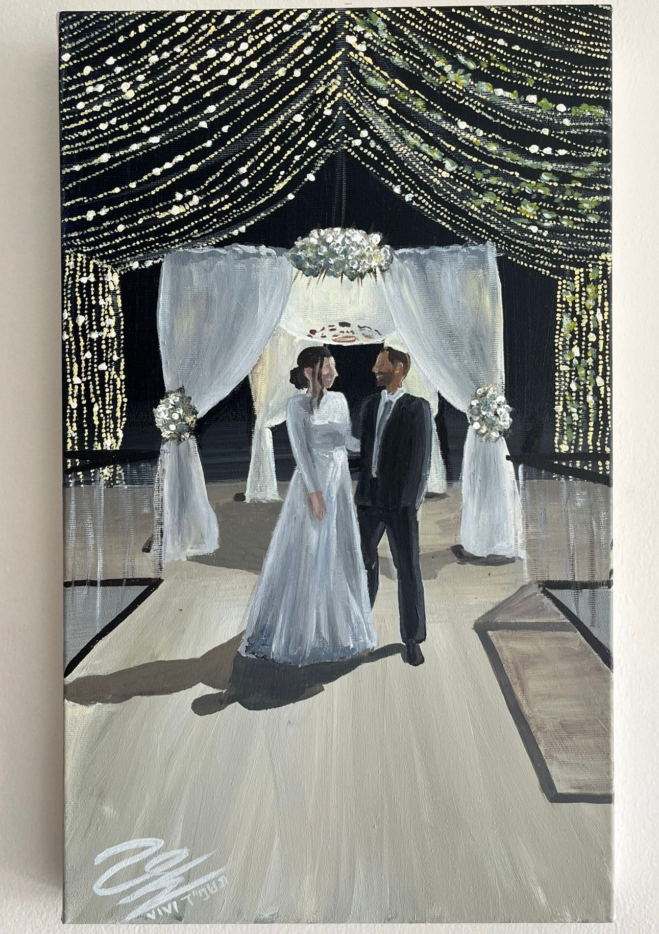 לא. הציור נעשה מתמונה, אותה אני דואגת לצלם בעצמי לאורך החופה, או מבקשת תמונה מהצלם. תמיד אני אקח כמה תמונות יפות ואתייעץ עם הזוג לגבי התמונה המועדפת עליהם.