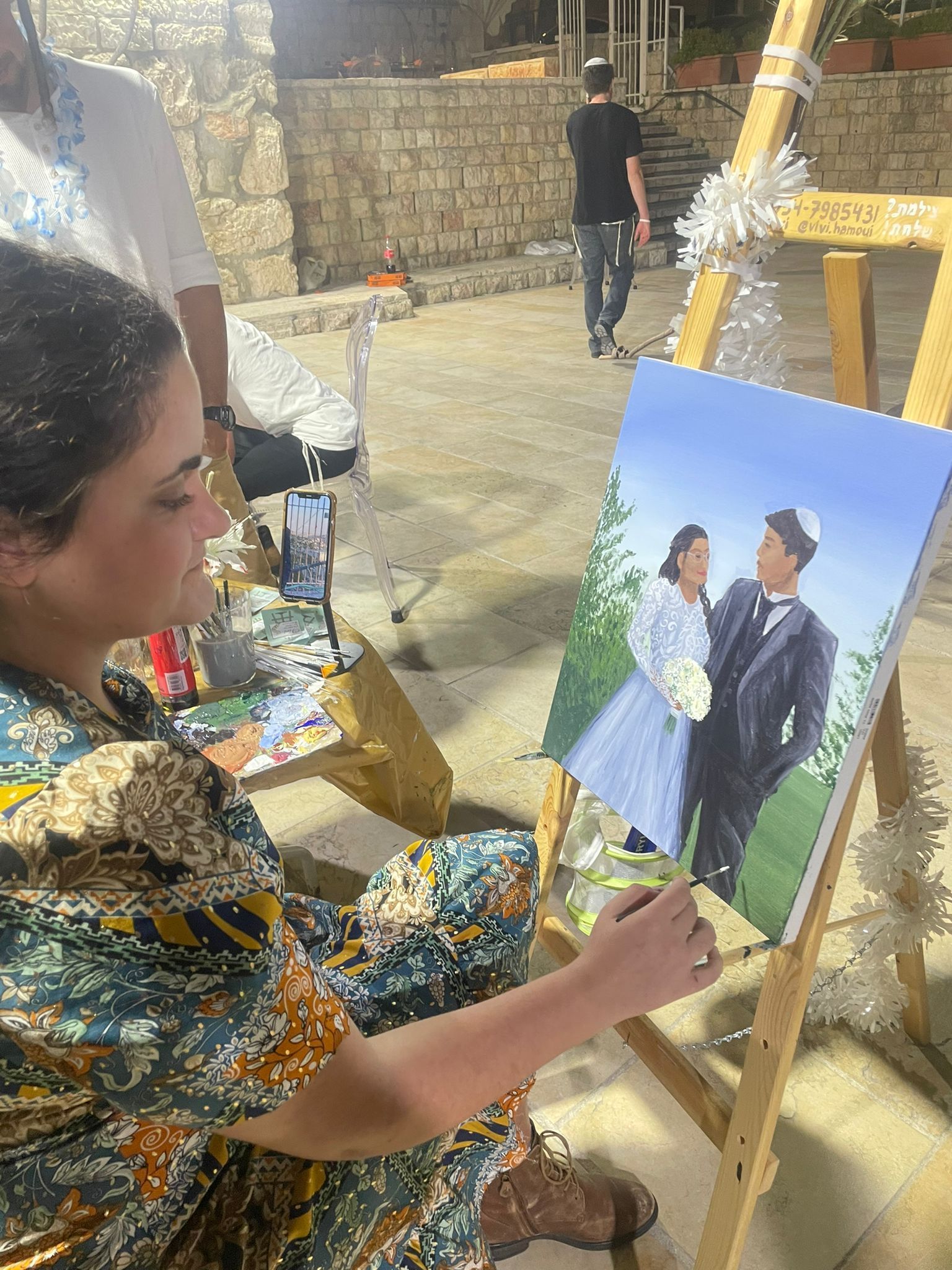לא. הציור נעשה מתמונה, אותה אני דואגת לצלם בעצמי לאורך החופה, או מבקשת תמונה מהצלם. תמיד אני אקח כמה תמונות יפות ואתייעץ עם הזוג לגבי התמונה המועדפת עליהם.